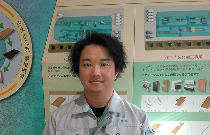 私は四年程前に家を建てました。そこでドア、テレビボード、クローゼットが永大小名浜製であることを知り自分もこういう仕事に携わりたいと思ったのが入社の動機です。